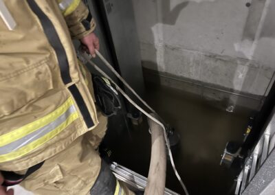 Maßnahmen: Mittels Tauchpumpe Liftschacht entleert, mittels Wassersauger Restwasser im Gang und Schacht aufgesaugt